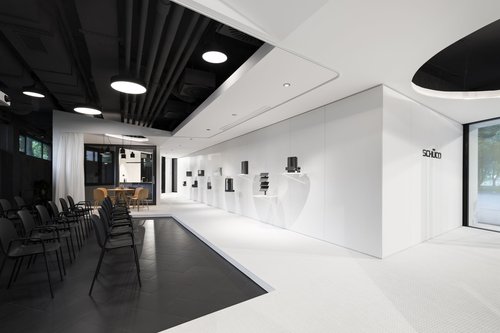 The creation of the interior of the Schüco showroom started with a two-round competition, which we won with a dynamic design for the arrangement and shaping of the embedded masses - interconnected fragments of the house, arranged in a strictly delimited space on the ground floor of a multifunctional building in Bratislava.