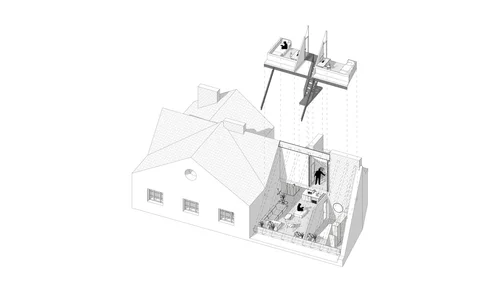 We insert a plateau and a box of closed offices into the vertical space. We take advantage of the height of the space as well as its technical character. All elements are purely functional and expressively left in their basic state. The plateau area complements the office programme with a rest area.